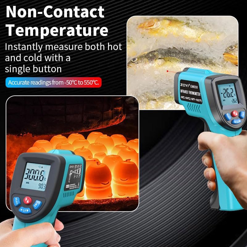 🌡️ The GM-550 is an industrial-grade infrared thermometer gun designed for fast, contactless temperature measurement from –50°C to 550°C. Featuring a bright backlit LCD, laser targeting and high-accuracy optics, it is ideal for HVAC, automotive repair, electrical work and home safety checks. 🔧