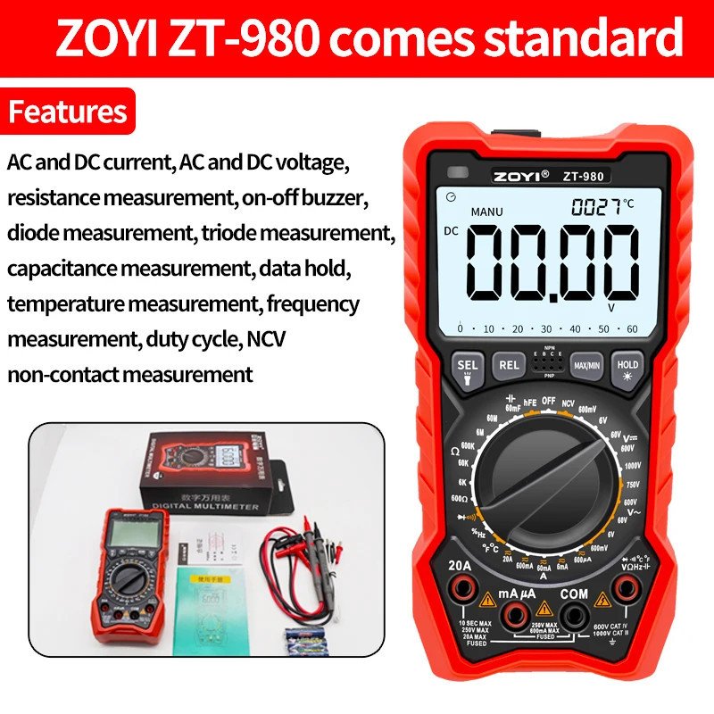 📟 The ZT-980E is a large-size 6000-count True-RMS digital multimeter designed for technicians, electricians and electronics repair. It includes a transistor tester, AC/DC voltage and current measurement, resistance, continuity, diode and frequency testing. ⚡