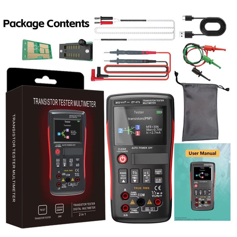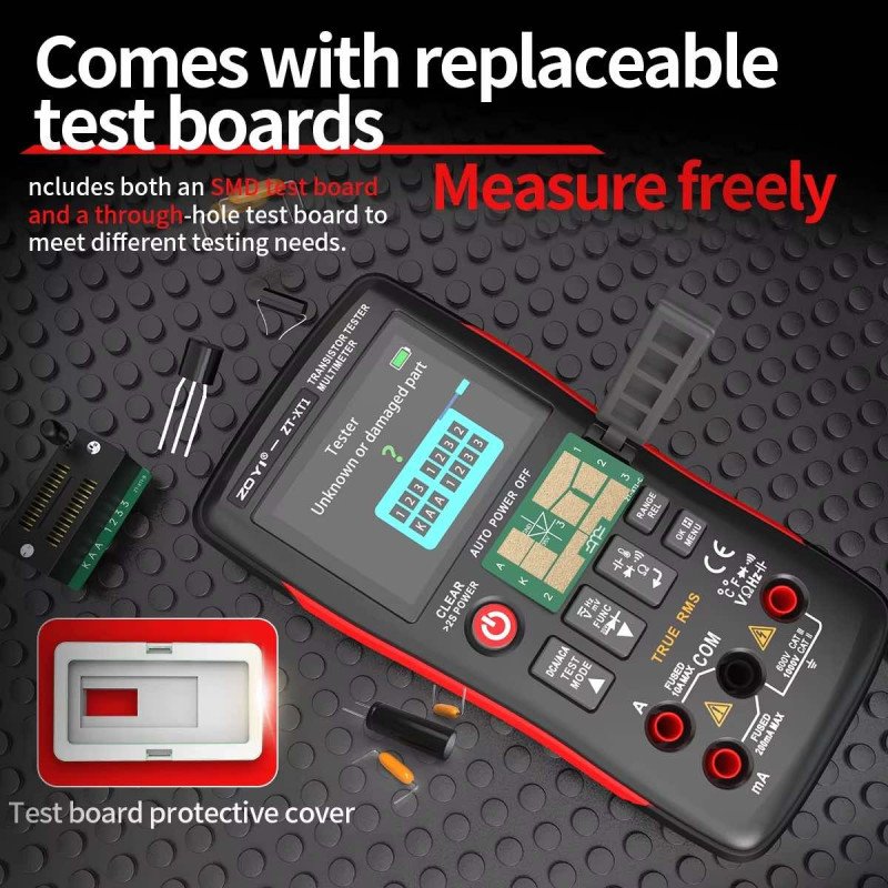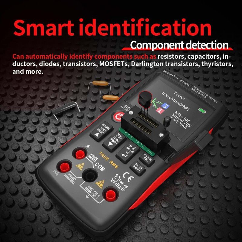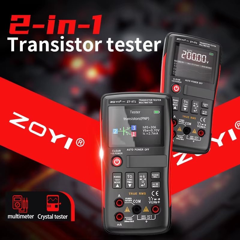 The ZOYI ZT-XT1 combines a professional transistor tester with a True RMS digital multimeter, allowing accurate measurement of electronic components without switching devices. It supports testing of BJT, MOSFET, IGBT, diodes, resistors, capacitors, inductors and more.