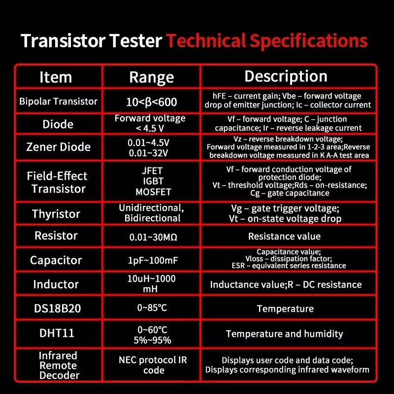 Accurately detects and measures transistor gain (hFE), diode forward voltage, capacitor value and ESR, resistance up to 30MΩ, inductance values, and semiconductor parameters.